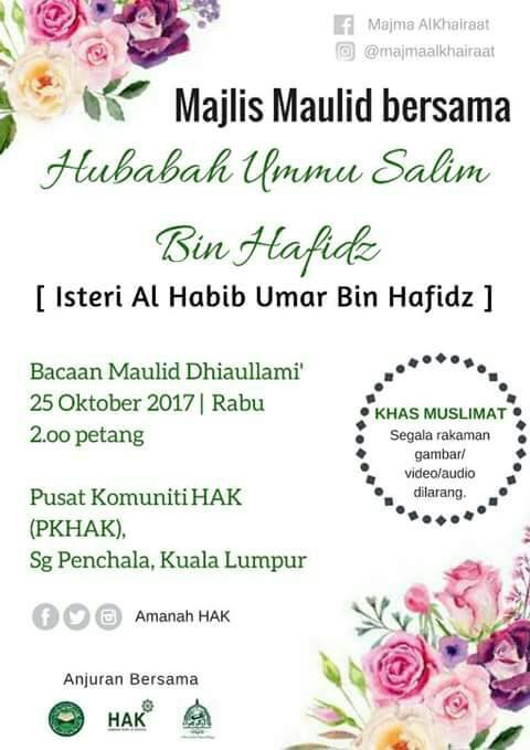 Alhamdulillah…dengan izin Allah swt yang memberi kemudahan & ruang kepada ana serta beberapa orang ahli keluarga untuk hadir ke majlis ilmu bersama Hubabah Nur (Zaujah Habib Umar Al Hafidz) atau dikenali sebagai Ummu Salim Bin Hafidz dari Darr Az-Zahra, Hadraulmaut Yemen pada 25.10.2017 di Pusat Komuniti HAK (PKHAK) Sg Penchala, Wilayah Persekutuan KL. Tausiyah ini telah diterjemahkan oleh Ustazah Fatimah Jindan.