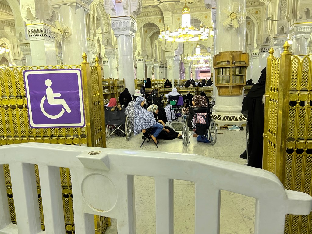 Begitulah juga keadaannya jika ingin masuk ke Raudhah. Ada laluan khas untuk yang berkerusi roda. Ia mudah & beruntunglah bagi orang yang berkhidmat menolak kerusi roda tersebut. Boleh solat & berdoa di dalam raudah dengan tenang.