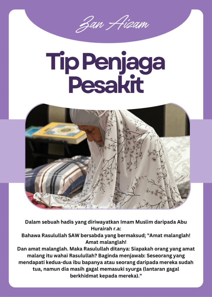 - Tingkatkan ilmu, iman & amal. Ini penting untuk ketenangan emosi penjaga pesakit dalam situasi dia cuba menenangkan pesakit. Contohnya membaca ayat-ayat Al Quran kepada pesakit, membaca zikir & selawat agar pesakit lebih tenang sekaligus menenangkan diri penjaga pesakit itu sendiri. Jika pesakit jenis yang suka marah, maka penjaga pesakit tak perlu banyak cakap atau berbalah dengan pesakit. Teruskan dengan zikrullah atau diam lebih baik. Mudah2han si pesakit akan ikut berzikir & tenang. Bab solat juga perlu dijaga. Boleh rujuk bab solat di FB saya Zan Aizan di link berikut: https://www.facebook.com/share/p/P2Pwjue6iL5FJL9q/?mibextid=WC7FNe