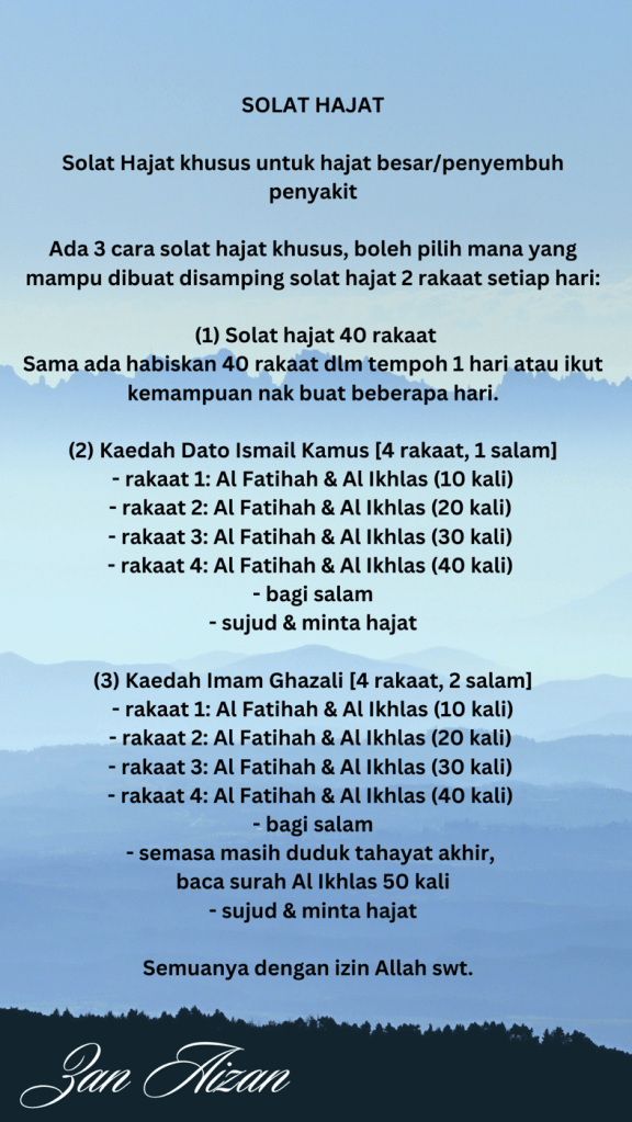 - Solat sunat hajat khusus cara Dato Ustaz Ismail Kamus atau Imam Ghazali (khusus utk hajat besar atau doa utk diri sendiri/anak/suami)