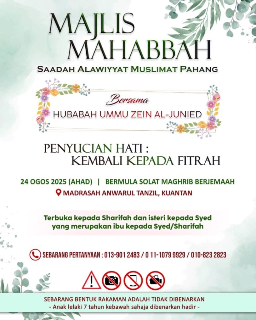 Blog ini telah di baca & di semak oleh Ustazah Sharifah Hafsah Bana Hasan (yang hadir ke majis saadah pada 24.8.2025), Pembimbing Pertubuhan Muafakat Ta’lim Pahang (MTP) & di baca juga oleh Al Habib Ali Zaenal Abidin Al Hamid sebelum edited edition.